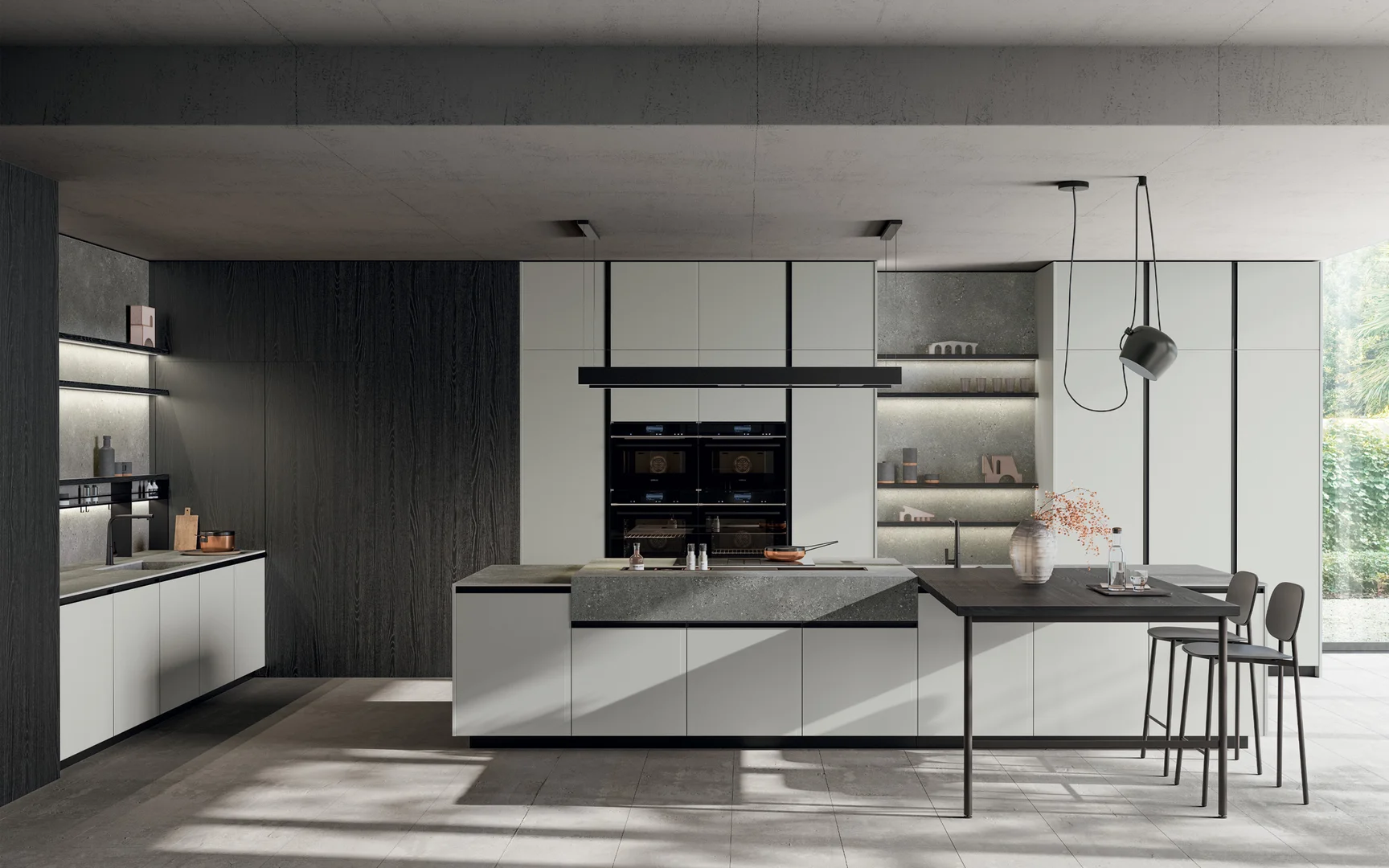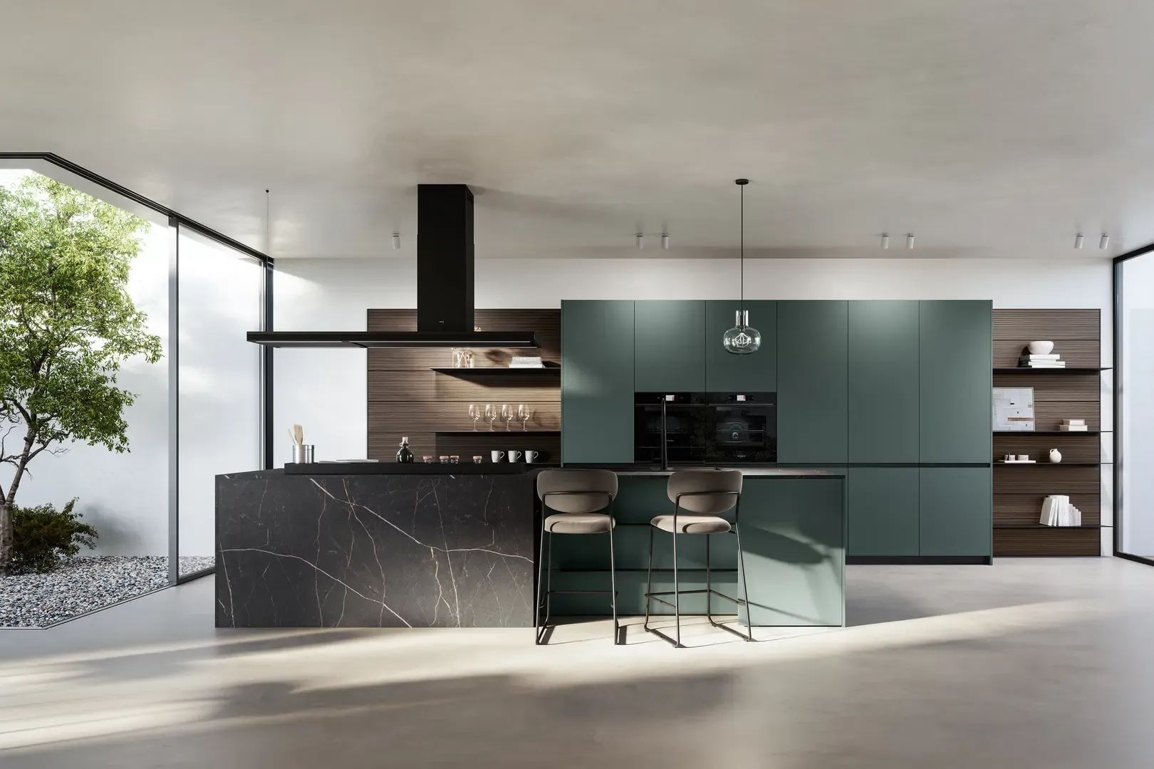 Podrás encontrar una gran variedad de estilos de cocina con acabados distintos, con puertas de marco visible con acabados de PET mate o lacado mate, puertas curvas en distintos colores, puertas de vidrio lacado brillante o mate, con un marco de aluminio, puertas sin tirador con sistemas de apertura de ranura de acero inoxidable.